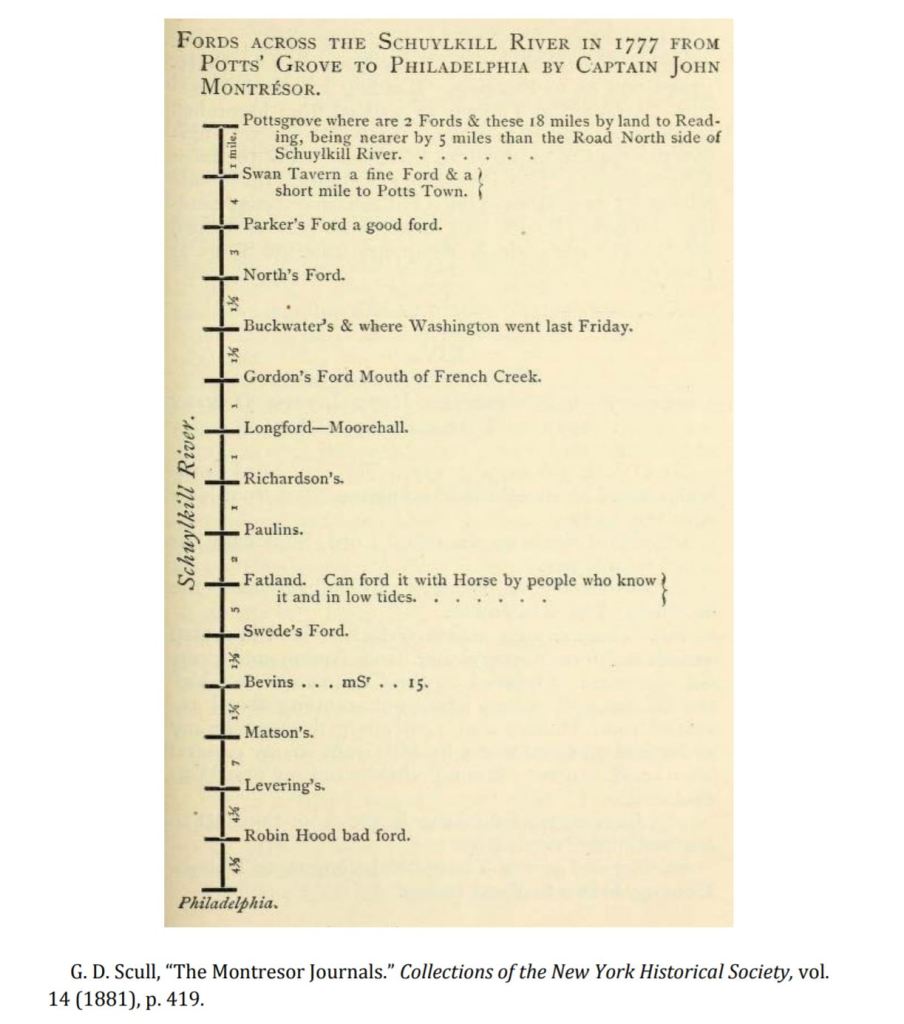The army started arriving at the ford in the early afternoon on Friday the 19th and then proceeded to cross. Lt. James McMichael wrote in his diary: “At dawn, broke camp and crossed the Schuylkill at 2 P.M., at Parker’s Ford, where we had to strip to wade. Reached the great road to Reading, passed the Trappe, crossed the Perkiomen, on the eastern bank of which we encamped. Through false alarms we got no rest, tho’ after such fatigue rest would have been very agreeable” (William P. McMichael. “Diary of Lieutenant James McMichael, of the Pennsylvania Line, 1776–1778.” Pennsylvania Magazine of History and Biography 16 (1892)) .