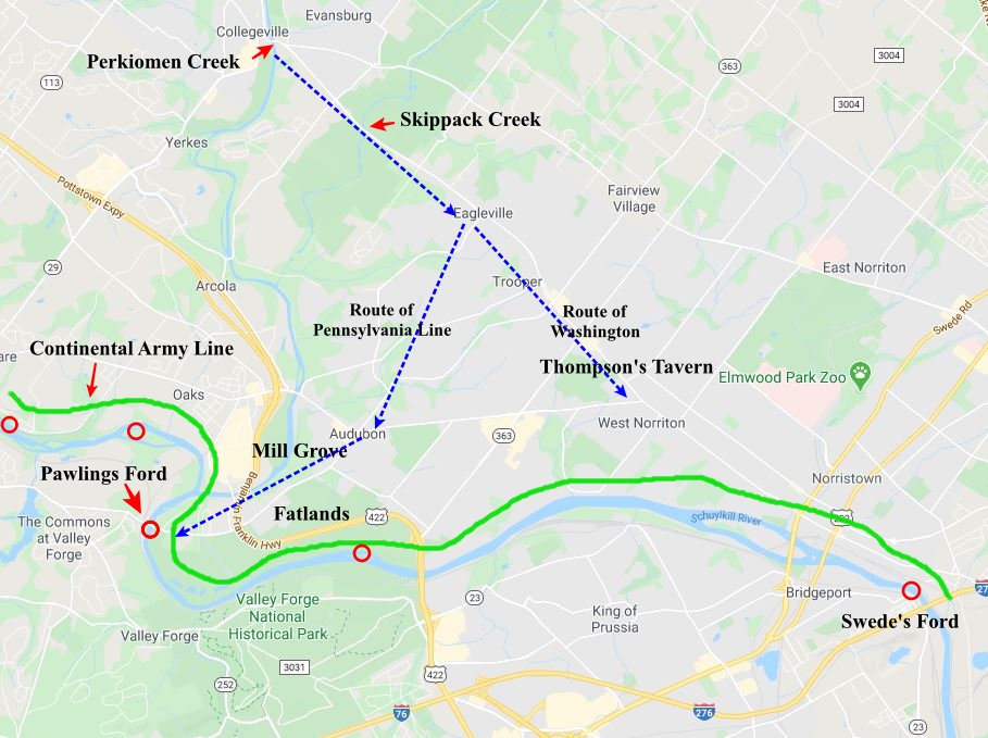 At 4:00 AM the army broke camp and headed down the Great Road, through Evansburg, “and crossed the Skippack, and thence to Pauling’s Ford, in Providence Township, where we encamped. We had a fair view of the enemy’s encampment, being only separated from us by the Schuylkill and a small hill.” (William P. McMichael. “Diary of Lieutenant James McMichael, of the Pennsylvania Line, 1776–1778.” Pennsylvania Magazine of History and Biography 16 (1892)). Although the exact route is unknown, although at least for McMichael’s unit, they probably went as far as Eagleville and then turned right and proceeded down Eagleville Road through Audubon to Pawling’s Ford. Thomas McGuire writes they took up “positions along the left bank of the Schuylkill on a nine-mile wide front from Gordon’s Ford to Swede’s Ford hoping to shield both Reading and Philadelphia.” (McGuire, “The Philadelphia Campaign – Volume One, Page 306. Gordon’s Ford is at present-day Phoenixville and Swede’s Ford is between Norristown and Bridgeport. Both armies were face-to-face and could see each other’s movements from across the Schuylkill. Unlike today, the area was probably denuded of trees in many areas, making it difficult to mask troop movements.