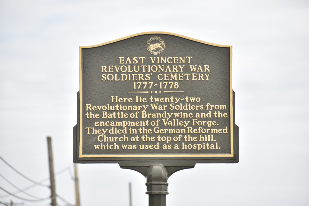 Close by to the East Vincent Church is the Zion Lutheran Church. Both congregations shared the East Vincent church until 1762 and the first building on this site was erected in 1775. The present building pictured was built in 1861 and is still in use today. Like East Vincent, Zion was used as a hospital during the Valley Forge encampment and soldiers are known to have perished there, however their grave sites are unmarked and unknown. It’s likely that they were buried in the original cemetery or near-by.