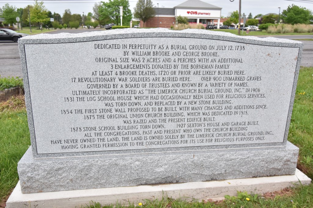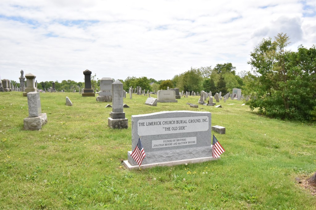A burial ground was established not related to the church in 1738. It’s unknown when the original church was built, however there was a log schoolhouse on the property that was used for church services (“Limerick Township: A Journey Through Time 1699-1987”) and the Limerick Church was referenced in the route description of Lewis Road in 1742. Plans for building a church at this location started in 1807, and the first building was erected in 1817. That church was torn down in 1875, and the existing structure pictured here was built then. The hospital department established a hospital at Limerick, however it’s unknown when are exactly where. A letter from Benjamin Rush to John Adams, dated October 13th, 1777 mentions Rush is writing from the hospital at Limerick. There are seventeen Revolutionary War soldiers buried in the cemetery, and it is estimated that there are hundreds of additional unmarked Revolutionary War graves here.
