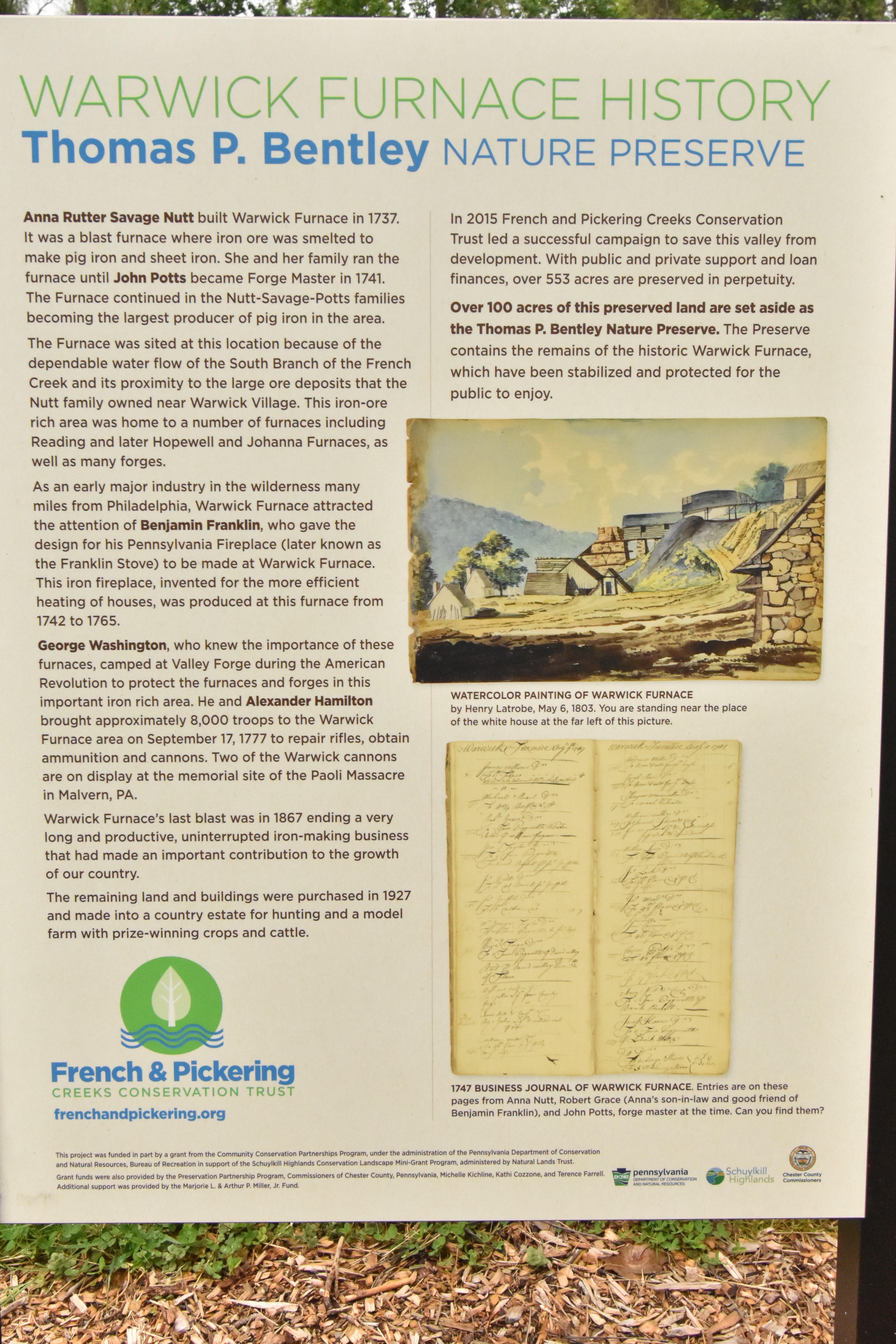 Both furnaces were actively producing canons and munitions for the Revolutionary War effort. Before and after the war, they continued to be commercial enterprises forging stoves and other metal goods. The Continental Army camped across a several-mile wide area from past Reading Furnace back to Warwick Furnace.