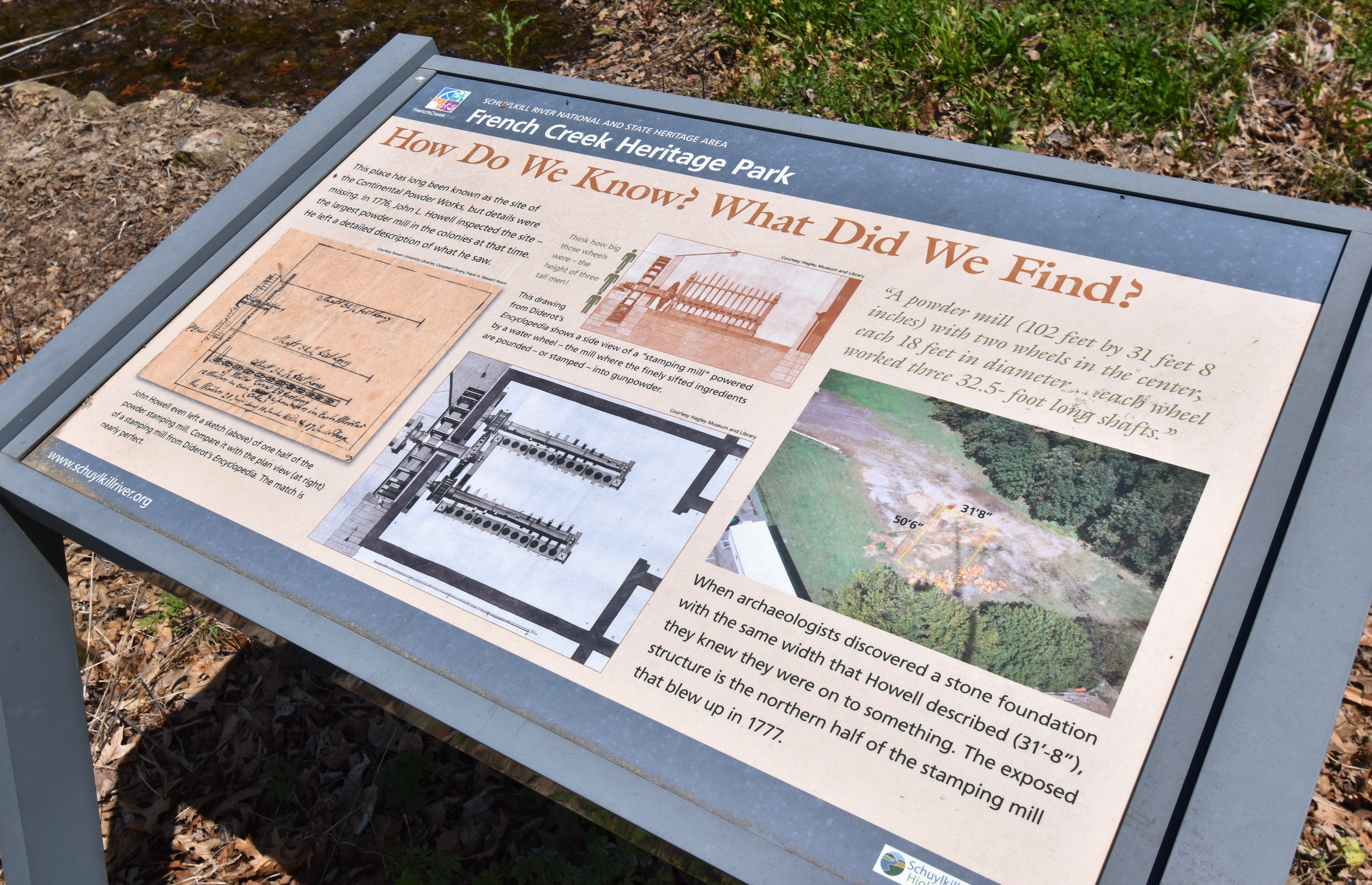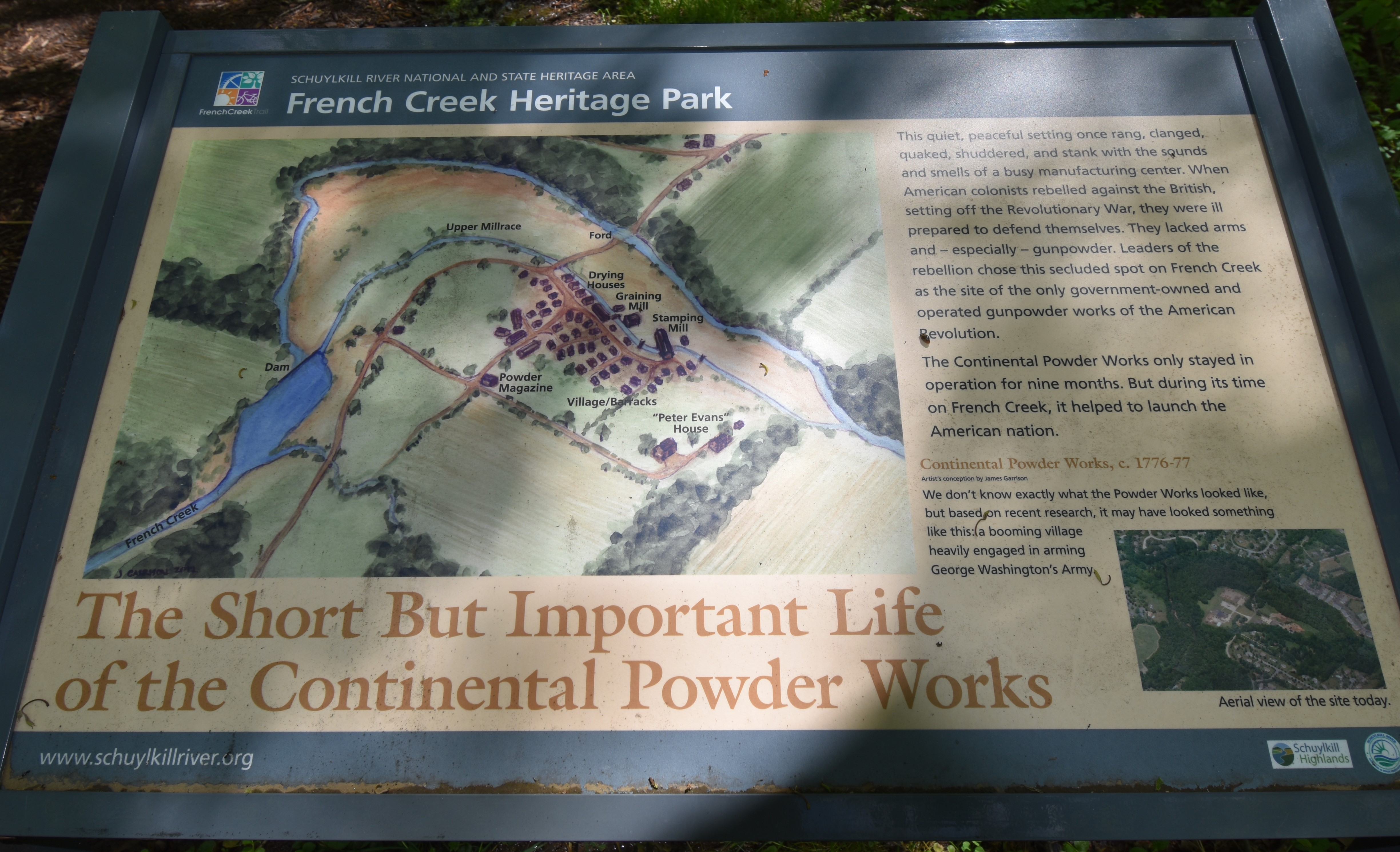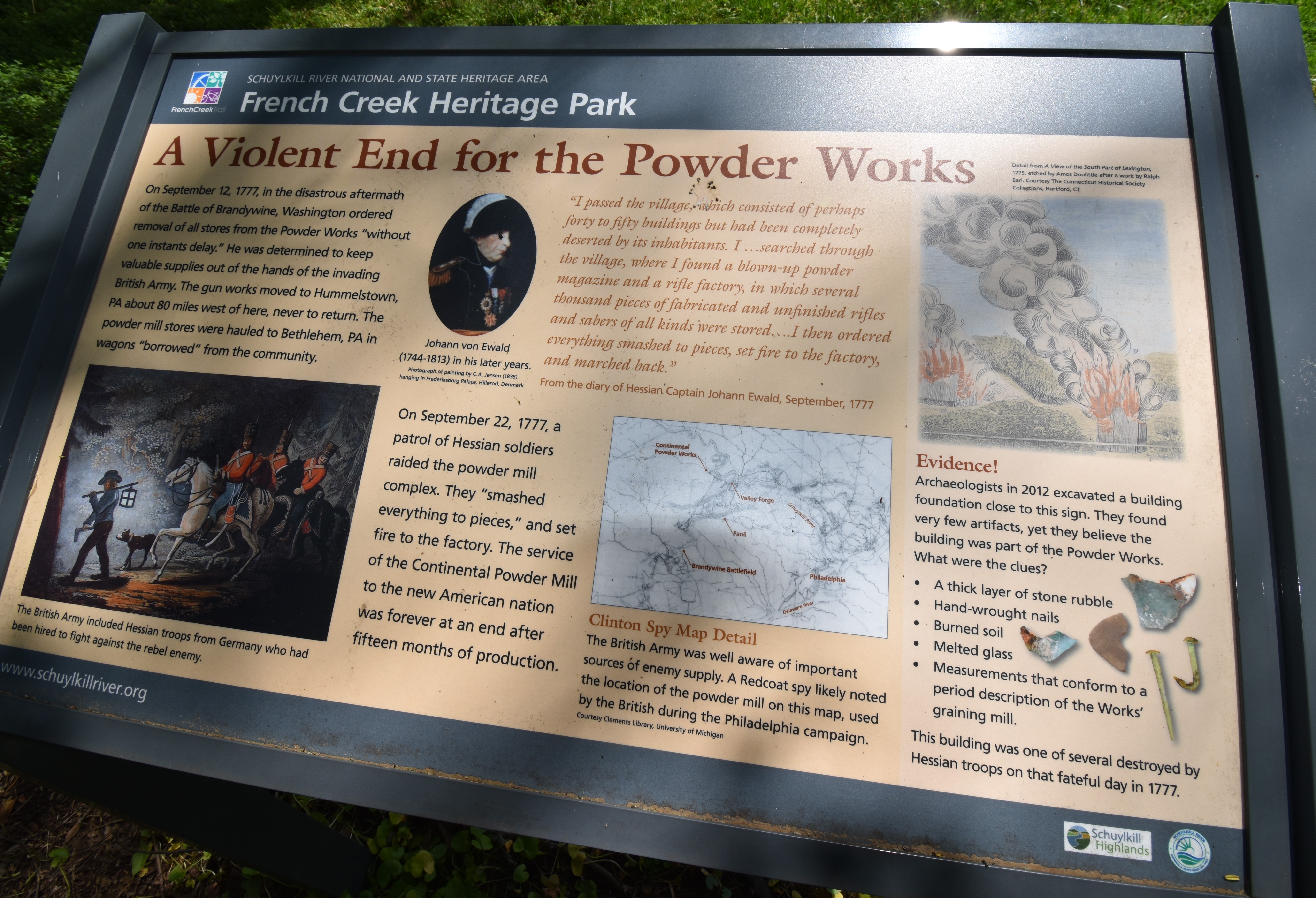 Some of the army marched to Warwick by way of the French Creek bridge in present-day Phoenixville and passed by the Continental Powder Works located there (The Journal and Order Book of Captain Robert Kirkwood). By September 1777, the powder mill has ceased production but small arms manufacturing continued. It is possible the Continental Army took what supplies were still there, however earlier on September 10th they began moving powder and guns out of the facility and away from the growing threat of the British Army. It is likely they moved some of the supplies West to the furnaces that were already producing cannon and other munitions (down present-day Rt. 23), and it is reported the powder was moved to Bethlehem.