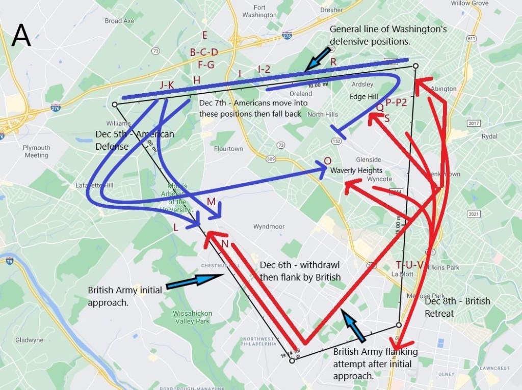 Many have described the Battle of Whitemarsh as a series of small skirmishes, however in a larger context, I’d describe it as strong defensive strategy by a very weak Continental Army while the British Army offensive strategy looked for, and eventually gave up on, an acceptable approach to attack. I’d also classify this as one of the few and far between victories for Washington since he wisely maintained his defensive positions and did not further pursue clearly failing offensive maneuvers as they occurred; they held the field afterwards, denied another British attempt to destroy the Patriot army; and the British retreated to Philadelphia at the end of the battle.