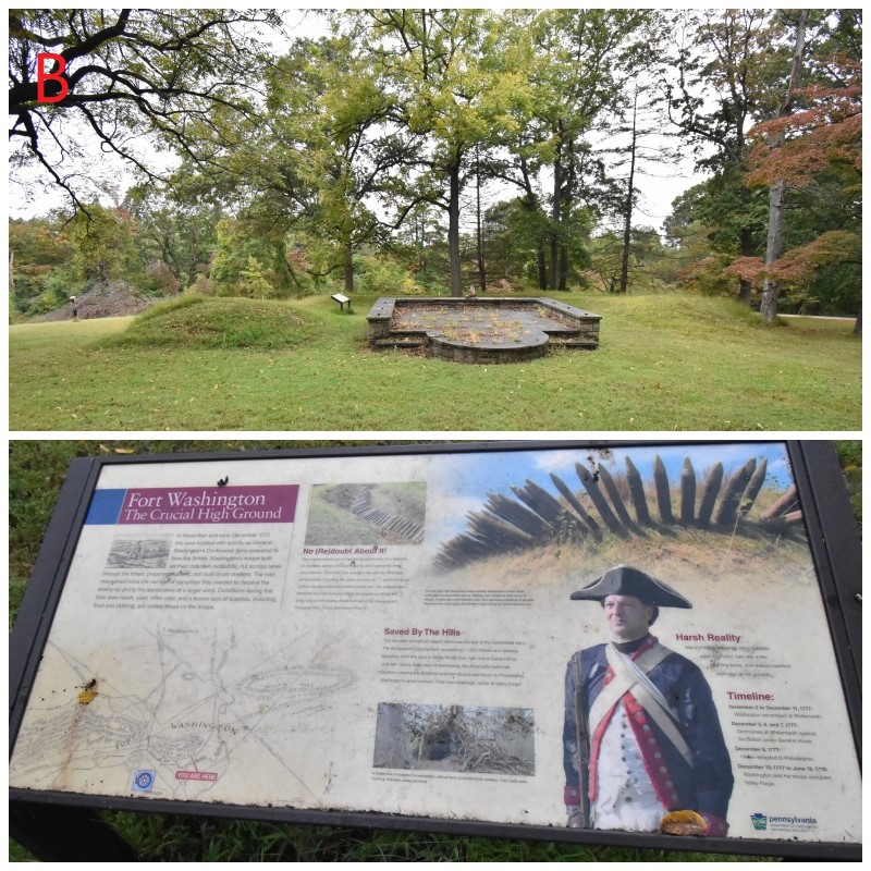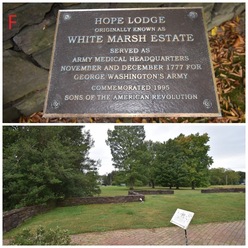 Photos F-G: Hope Lodge – Built in 1740, Washington’s chief surgeon, John Cochran, and other physicians resided here and used as a hospital. It is located between Fort Hill and Camp Hill on Bethlehem Pike. The picture of the grounds is facing west towards the Pike and is easy to picture Continental troops and others occupying the ground around the building, which is now a museum that is owned Commonwealth of Pennsylvania.
