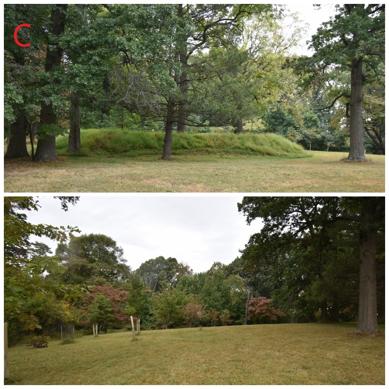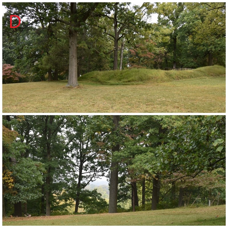 Photos B-C-D: The first stop on the tour, the Fort Hill location, in Fort Washington State Park. This is the center hill in the American line with Militia Hill to the West and Camp Hill to the East. B & C show the remains of the redoubts looking south towards Philadelphia and D is looking north. Notice the bottom photo on D and the trees in the center distance which will give you some idea of how high these hills are compared to the near surrounding countryside. The Continental Army had spent all of November 1777 in these positions, so their defenses were well established.