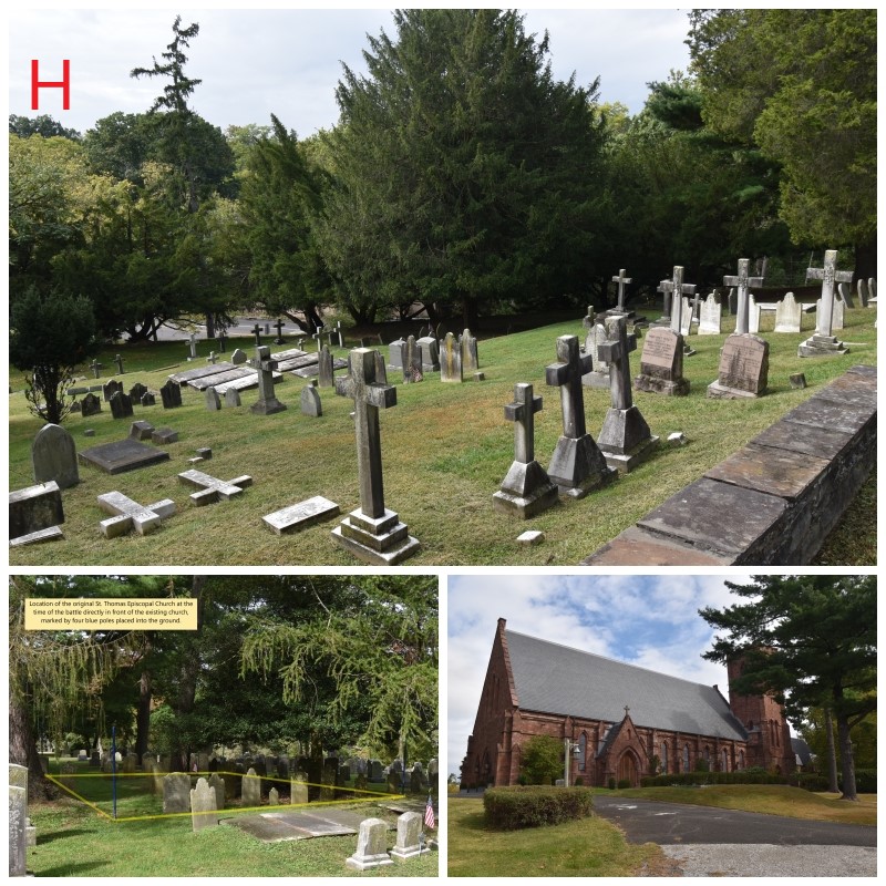 Photo H: St. Thomas’ Episcopal Church is located on a hill above the intersection of Bethlehem Pike, Church Road and Camp Hill Road. Washington stationed four hundred troops with artillery to command this position in front of the main line running from Militia Hill to Camp Hill. The top view is overlooking Bethlehem Pike, and the bottom right view is the present-day church. The bottom left view is the location of the original church at the time of the battle. It was a small stone church and was replaced in 1818.