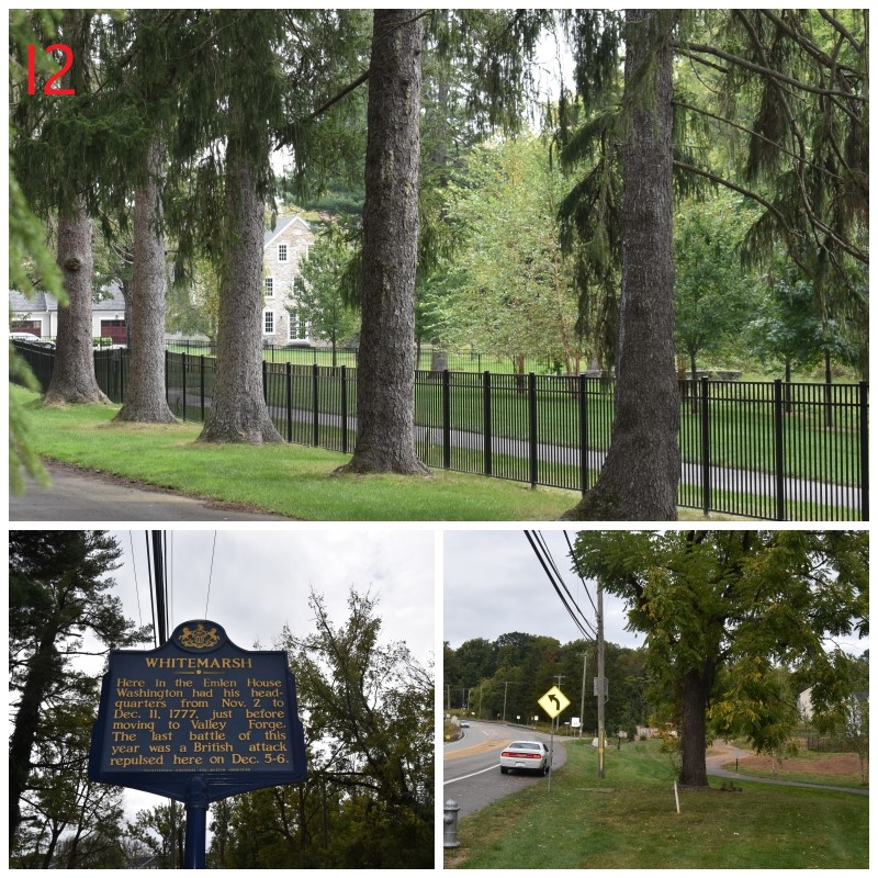Photos I-I2: Continental Line and the Emlen House, along Camp Hill Road looking east toward Washington’s HQ and west back towards St. Thomas Church. Troops were stationed along this line extending about two miles to the east, as well as Camp Hill, which was to the North of this line. Just South and below this line is the Emlen House which served as Washington’s Headquarters during the battle. The home is now a private residence and not open to visitors. In the bottom-right photo, the Continental lines were located to the left and background uphill from the Emlen House. (Take note of the white, 2014 Dodge Challenger, which has visited almost as many AmRev sites as I have.)