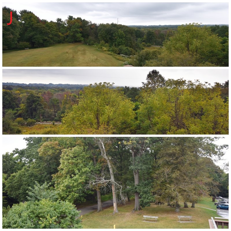 Photos J-K: Militia Hill, located in the Fort Washington State Park off Militia Hill Road. This location was the far right flank of the American lines and was occupied by the Pennsylvania militia (hence the name) under Potter and Irvine, and the 2nd Connecticut Regiment of the Continental Army (I’m sure there were some regulars cursing the fact they were paired up with the militia who had a terrible reputation, deservedly so.) At this site is an observation tower (primarily for birding, see interpretive panels in photo K). The top view in photo J is looking southeast towards Abington and Jenkintown; the middle view is looking south towards Chestnut Hill and Germantown; and the bottom view is looking west up the hill towards where the American troops were camped. Years ago, I camped here several times as well with my son in Cub Scouts, I wish I had known more about the battle back then.