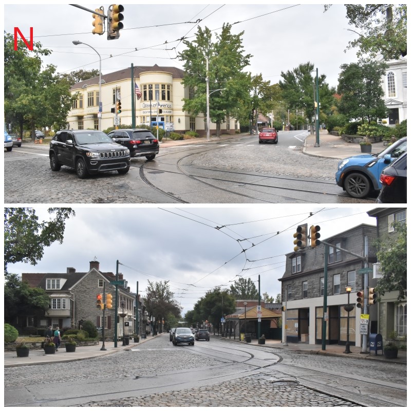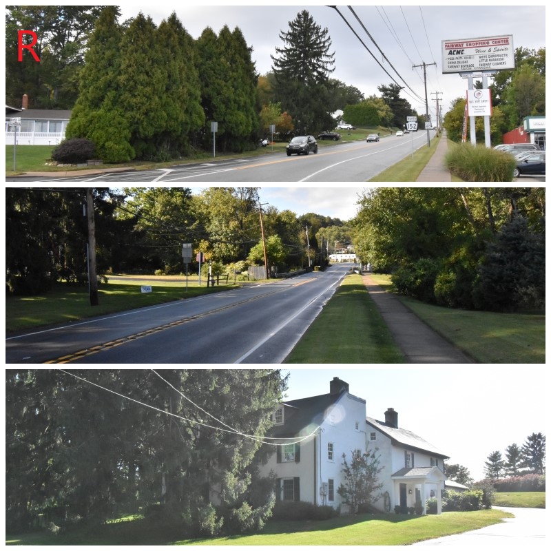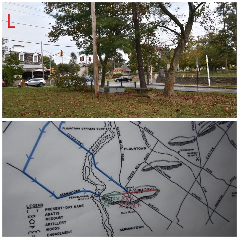 Photo N: Howe’s Headquarters at the intersection of Germantown and Bethlehem Pikes. The top photo is the location on the northeast corner of the intersection which was the Matthias Bush house, Howe’s headquarters during the 5th and 6th of December. This is not the original building. Irvine’s attack on the 5th started about a mile down the road to the right, Bethlehem Pike. Potter’s attack on the same day occurred a little over a mile down Germantown Pike to the left.