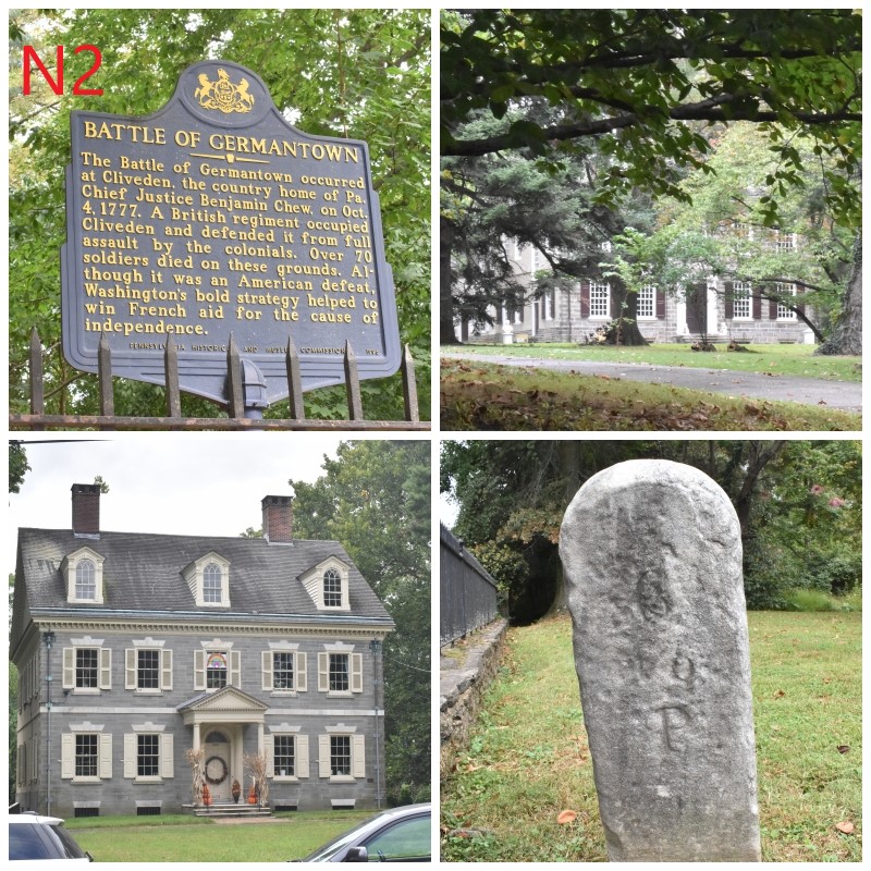 Photo N2: Germantown. The British army now passed back through where they had fought two months previous, and although there was no Battle of Whitemarsh-specific activity, I am including these Germantown photos. I doubt I will do any specific posts on Germantown, considering the coverage it is getting with Michael Harris’ new book: “Germantown: A Military History of the Battle for Philadelphia October 4, 1777” and most of the historic sites there are either completely closed due to Covid, or only open during the week with very limited hours. The top right photo is Cliveden, or the Chew Mansion, then center piece of action during the October battle. Both the grounds and building were closed on the Saturday we were there. The lower right picture is a mile-marker on the grounds right at Germantown Pike. I thought it was cool. Lastly, the photo on the lower left is Upsala. This mansion is located across Germantown Pike from Cliveden, but the current building was not built until 1797. Both armies maneuvered over the grounds and past the original house that day. Though the current building is not significant to the battle, it is still a great story. Now it is privately owned by a young couple who are actively restoring it to their liking. If you’re into restoration or old buildings, they have great social media accounts and you can check out their webpage here: https://historicupsala.com
