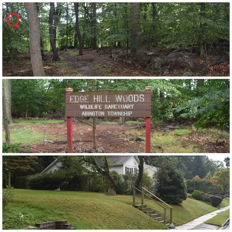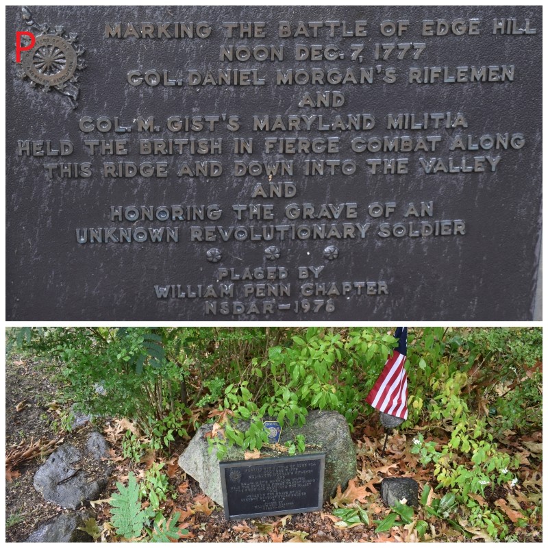 Photos P-P2: Battle of Edge Hill – Unmarked Revolutionary War Soldier’s Grave. This location is in a residential neighborhood on the sidewalk’s edge in between two homes. It’s easy to miss if there are cars parked along the street. The photos are a close-up of the monument and then a wider view featuring my friend Dave. The bulk of Howe’s army continued after Grey’s departure up to Jenkintown Road and Old York Road and then turned left to move toward the American’s on Camp Hill. Washington realized Howe was trying to flank him and ordered Daniel Morgan’s riflemen and the Maryland Militia under Mordecai Gist to move from Camp Hill southeast towards the eastern end of Edge Hill across the valley below the American lines.
