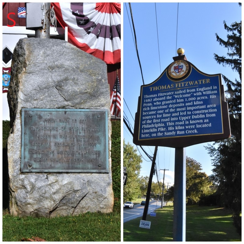 Photo S: A little less than one mile and a half down Jenkintown Road from the location in Photo R is the North Penn VFW, the location of the graves of four unknown American Revolutionary War soldiers who died during the fighting at Edge Hill. Their remains were discovered on the south side of Edge Hill a short distance beyond the rear of the VFW building and were re-interred here in 1953. The other photo is of the historical marker at the Thomas Fitzwater House, back up Limekiln Pike.