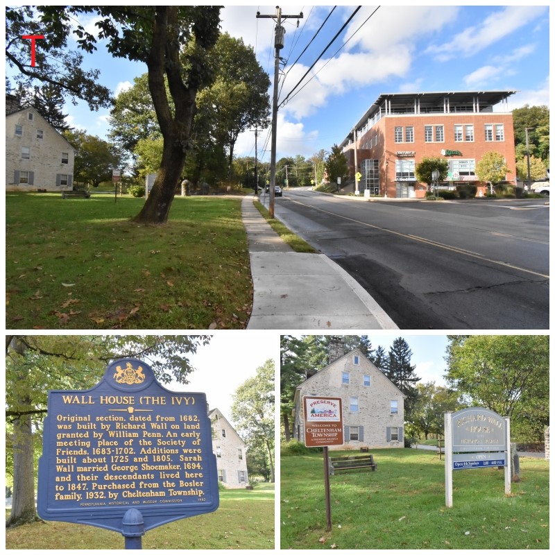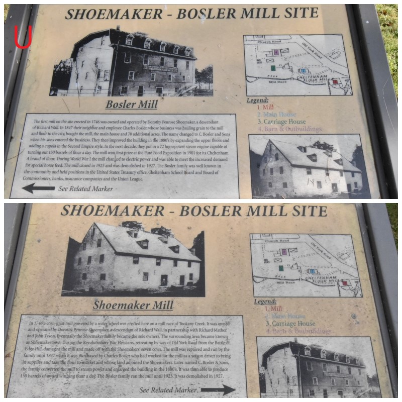 Photos T-U-V: The Wall House & Shoemaker’s Mill stop on the tour is located on Old York Road where it intersects with Church Road. The original home is in a small, surrounding park with several interpretive displays that describe the mill operations which occurred here (Photo U). On Dec. 8th, Howe began pulling his troops from their positions opposite the American lines along Camp Hill. The British Army moved down to Old York Road and then turned right towards Philadelphia. The main army would have marched down the road towards the camera in the top photo. Grey’s troops left their positions and marched down Church Road to this location, having been harassed by some American troops along the way. His unit stopped here and took the opportunity to loot and damage the mills located here.