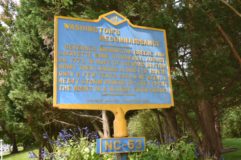 Prior to the American troops moving into position around Iron Hill, Washington decided to reconnoiter the situation and on the 26th, he rode with Lafayette, Nathaniel Greene and General George Weedon (and perhaps others including dragoons) to the top of Iron Hill. From there, they proceeded to Gray’s Hill, which is about two miles east from the center of Elkton. Thanks to several accounts by both Washington and Lafayette, sorely lacking in detail, a story has developed that Washington could have been easily captured, and they stayed the night in a house at the base of Iron Hill. Lafayette wrote two years later: